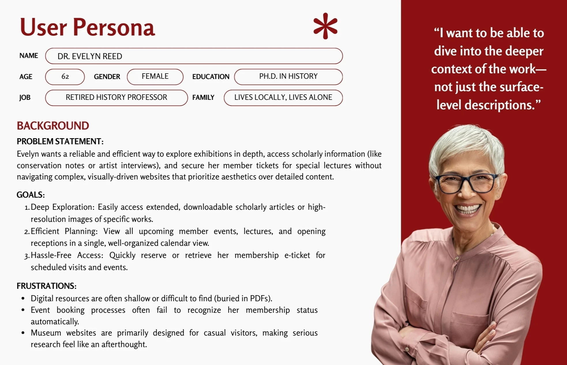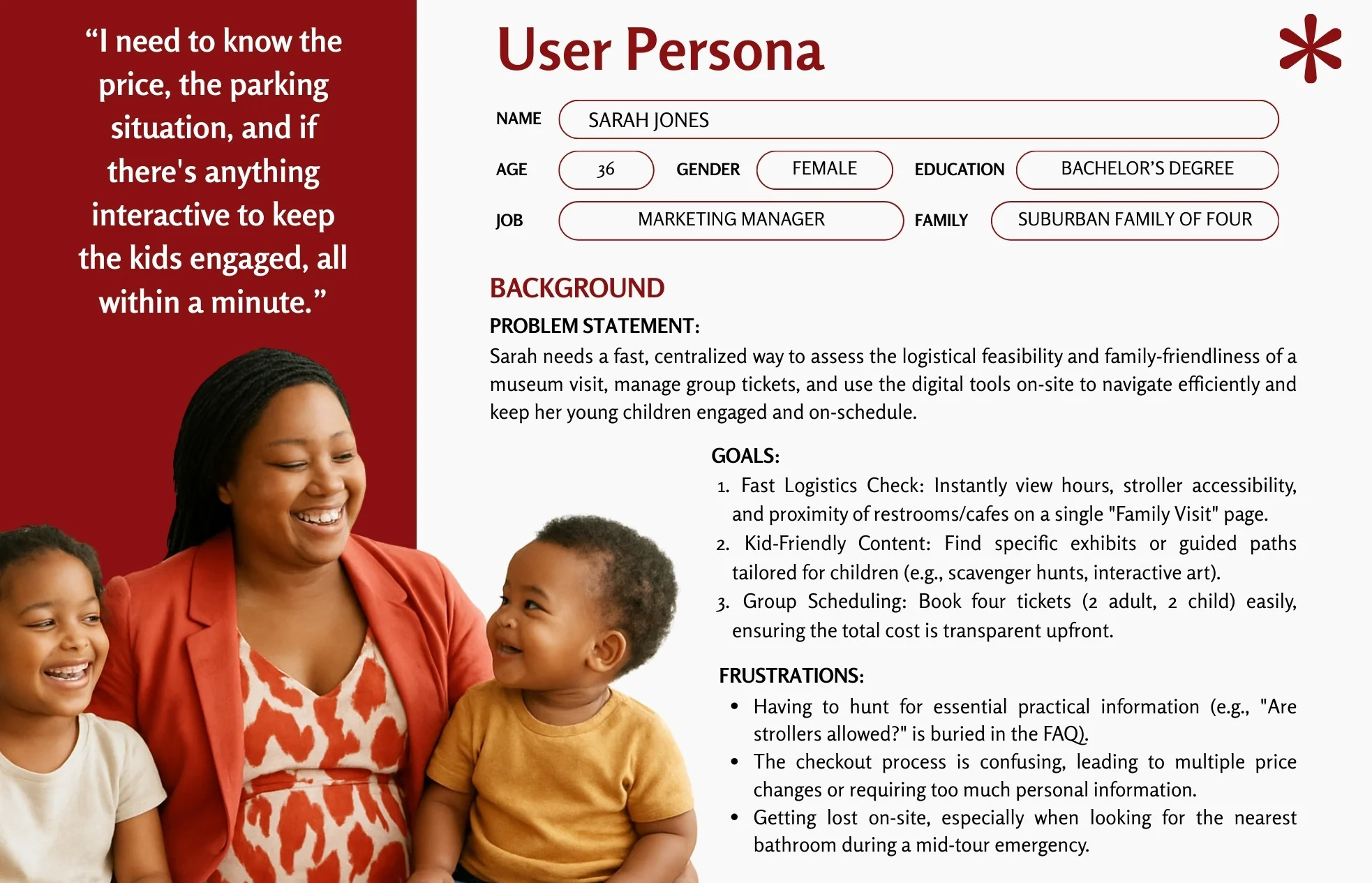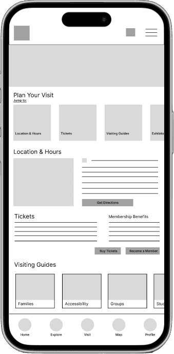 Museum patrons lack a centralized, mobile-friendly way to plan visits and explore the collection. Fragmented information across non-responsive platforms creates significant logistical friction for families and professionals, while a lack of on-site digital tools prevents visitors from accessing deeper artistic context or navigating the physical space efficiently.