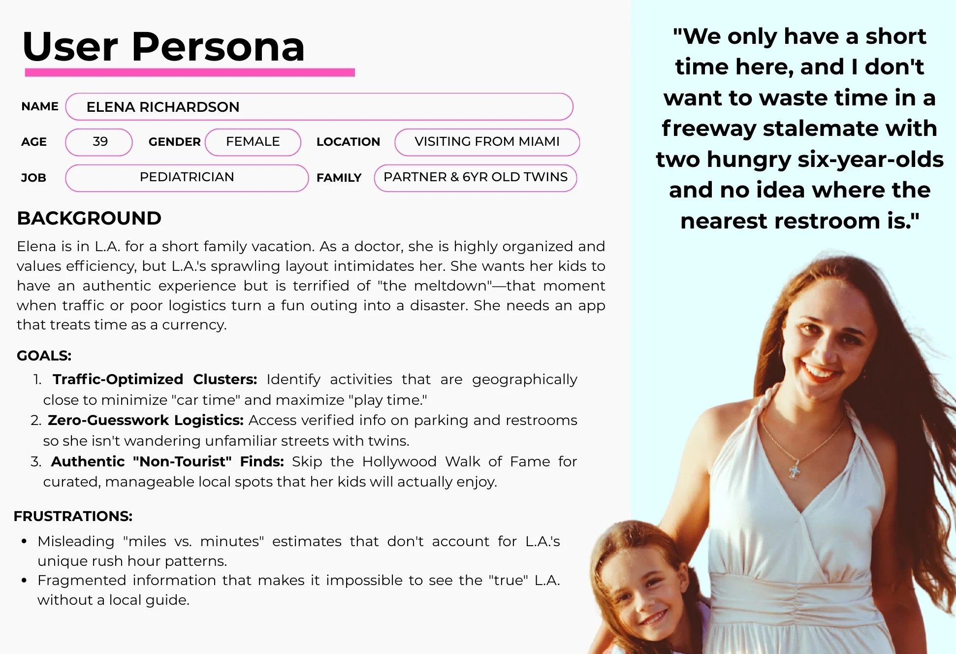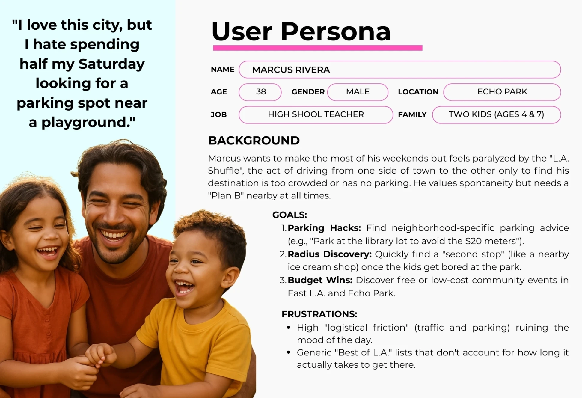 People in Los Angeles struggle to navigate the city's vast landscape due to significant "logistical friction," including unpredictable traffic, scarce parking, and fragmented information regarding family-friendly amenities. While many digital resources offer high-level event discovery, they fail to provide the real-time, location-based utility and trusted curation required to plan and execute a stress-free family outing in a complex metropolitan environment.